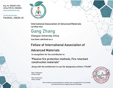 张岗教授当选国际先进材料协会(International Association of Advanced Materials,IAAM)会士(FIAAM),以表彰其在“桥梁结构智能防火新方法与新材料”领域做出的突出贡献。张岗教授应邀做了“IAAM Fellow Lecture 2022”的会士报告,着重介绍了研究团队在智能纤维混凝土的熔热阻爆机制和高性能组合结构桥梁抗火与防护新技术方面的系统工作。