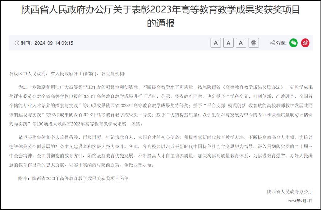 近日,陕西省人民政府发布《陕西省人民政府办公厅关于表彰2023年高等教育教学成果奖获奖项目的通报》(陕政办函〔2024〕104号),伊莉讨论区