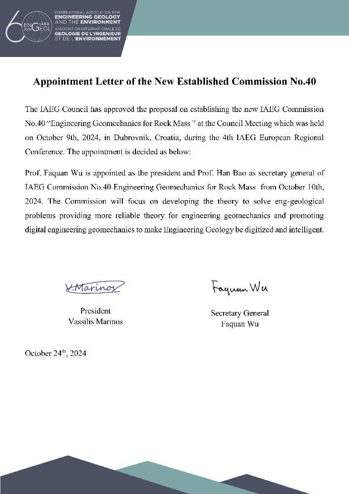 国际工程地质与环境协会(IAEG)成立于1964年,隶属国际地质科学联合会(IUGS),是一个全球性的科学学会,拥有超过4,857名会员和68个国家团体。IAEG关注于人类工程活动与地质环境相互作用而可能产生的工程和环境问题,以及预测和制定预防或补救地质灾害措施。岩体工程地质力学委员会(EGRM)致力于工程地质力学基础理论与应用技术创新,将在推动交通基础设施安全建设与健康运维、以及交通廊道防灾减灾等方面发挥重要作用。