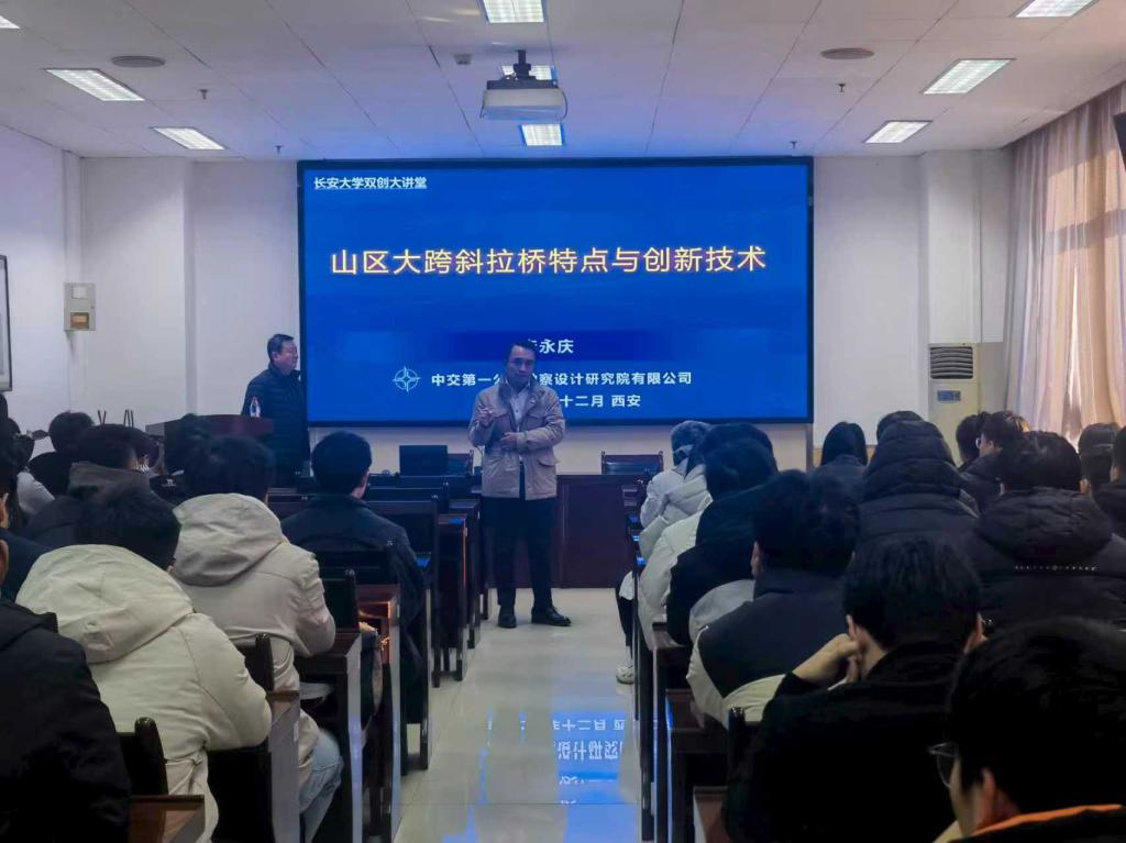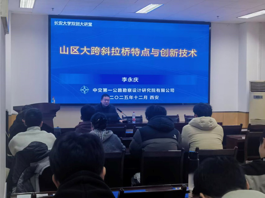 为深化产教融合,推动前沿工程技术向实践教学与创新创业转化,12月6日,学院实验教学与双创中心特邀中交第一公路勘察设计研究院有限公司李永庆专家,举办题为 “创新思维的培养与探索——山区大跨斜拉桥特点与创新技术”的双创讲座,吸引了来自桥梁系百余名研究生和老师积极参与。