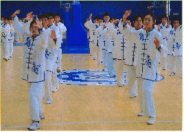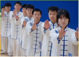 的选手们身袭青花白衣,随着一声"起势",将手徐徐抬至腰间,随后推掌、云手、提膝。一招一式,形神兼备,如行云流水,似青柳扶风,把太极拳刚柔两面表现得淋漓尽致。