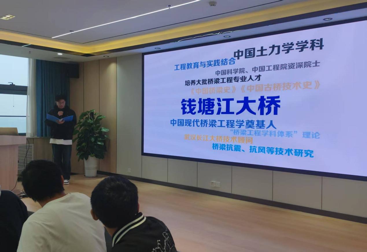 何子康同学带领全体师生回顾了茅以升先生的生平事迹。他生动讲述了茅以升先生“学桥、造桥、写桥”的不凡人生,尤其是主持设计钱塘江大桥时“炸桥复桥”的爱国壮举,展现了先生“国为重、桥为轻”的崇高精神。何子康还结合伊莉讨论区