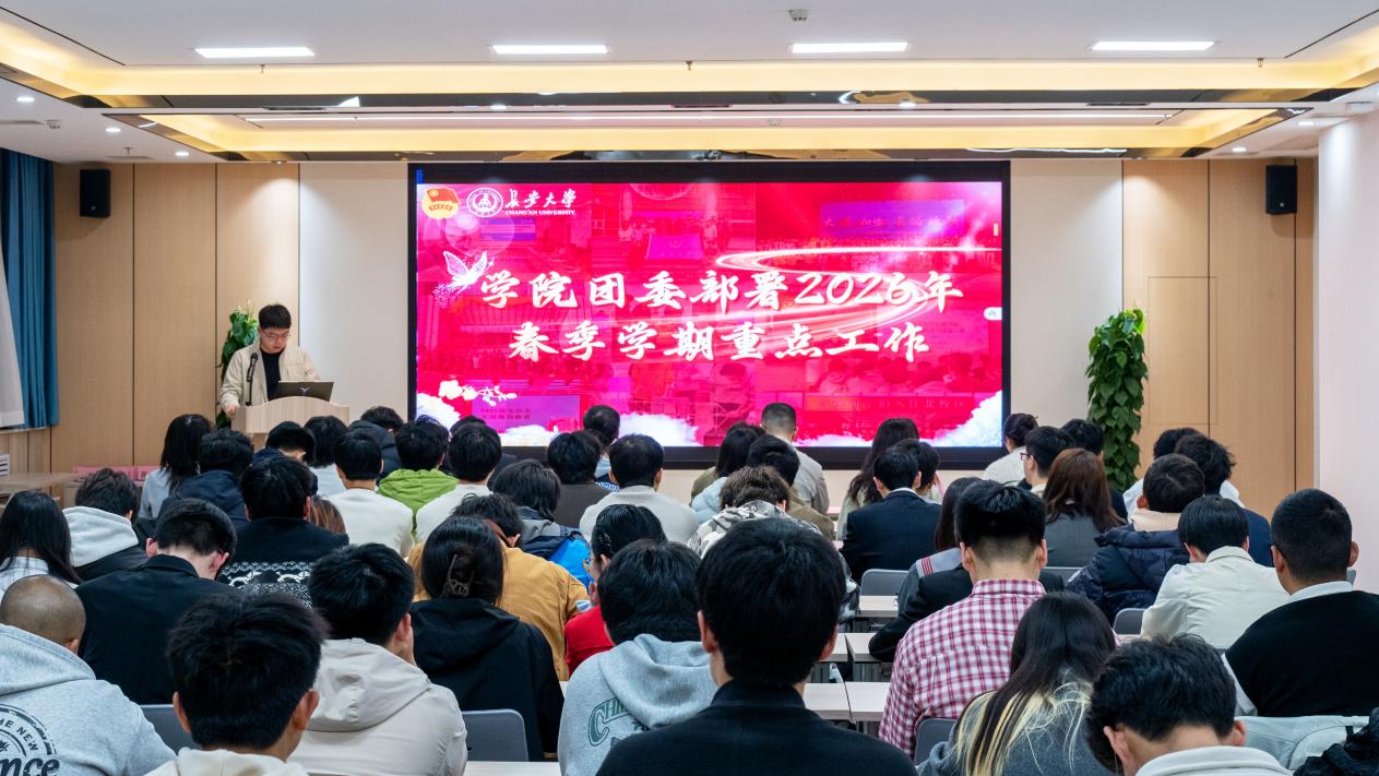 团委在弘毅大厦六楼第三会议室召开2026年春季学期工作交流会,研究部署新学期重点任务。学院党委副书记贾历波、学院学生工作办公室主任卢毅、学院团委副书记王路及全体辅导员,以及各团学组织、学生社团主席团成员和部门负责人代表参加会议。会议由学院团委副书记李璟瑜主持。