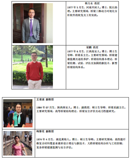 桥梁与隧道学科招收学术型与专业行硕士研究生,学制均为3年,其中,桥梁方向开设弹塑性力学、结构工程数值方法、桥梁结构理论、混凝土结构理论、结构可靠度、结构动力学、结构稳定理论、结构疲劳与断裂、桥梁模型试验、桥梁风振与振动控制、桥梁地震动与减隔震、桥梁结构非线性与仿真、桥梁监控与健康监测、桥梁结构防灾与减灾、桥梁评定与加固方法、桥梁概念设计、桥梁工程发展趋势等专业课程。开设以下研究方向: