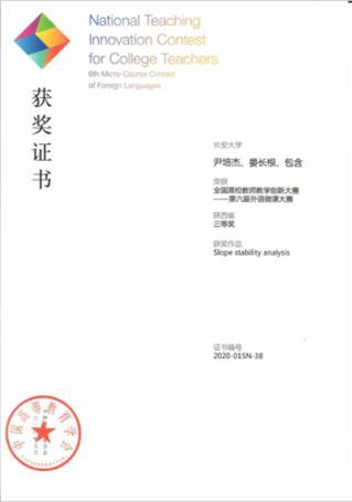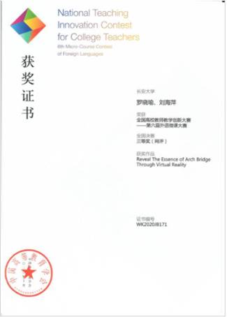The competition started in March in 2020 and ended in November 2020. The entire process has gone through school competitions, provincial competitions, and national competitions. Teacher Luo Xiaoyu from college of highway won the irst prize of the provincial competition, and finally won the third prize of the national undergraduate English group. In addition, Teacher Yin Peijie won the third prize of the provincial undergraduate English group.