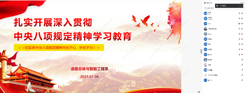 2025年7月6日,道路总体与智能工程系通过线上会议平台组织开展了中央八项规定精神专题党课,学院副院长马峰教授应邀作专题党课报告。